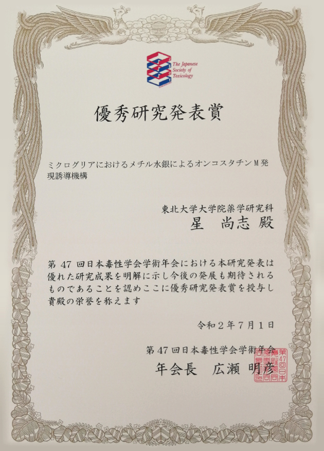 星 尚志さん(大学院生・D1)が第47回日本毒性学会学術年会で優秀研究発表賞(35歳以下対象)を受賞しました。